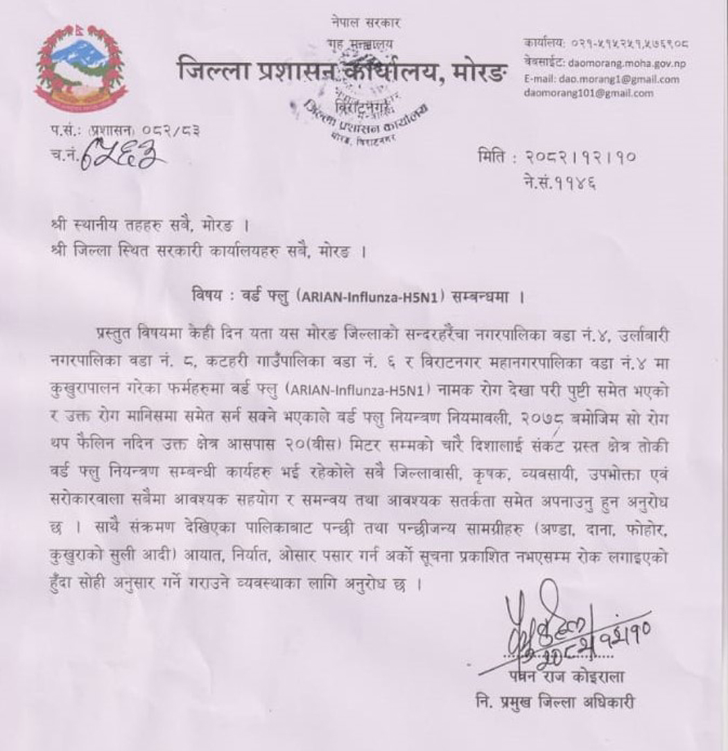 निमित्त प्रमुख जिल्ला अधिकारी पवनराज कोइरालाद्वारा जारी सूचनामा जिल्लावासी, कृषक, व्यवसायी र उपभोक्ता सबैलाई आवश्यक सहयोग र समन्वय गर्न अनुरोध गरिएको छ । रोग नियन्त्रणका लागि प्रभावित क्षेत्रमा प्राविधिक टोली परिचालन गरिएको र सुरक्षाका सम्पूर्ण उपायहरू अपनाउन प्रशासनले विशेष आग्रह गरेको छ ।