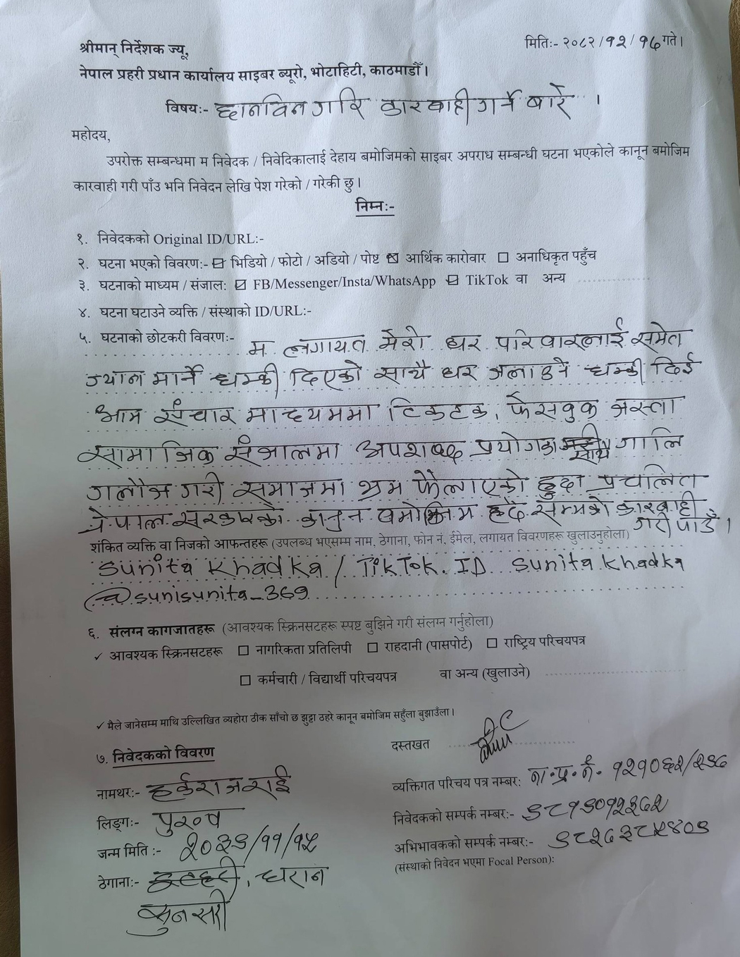 ‘मलाई रास्वपाका समर्थक सुनिता खड्का नामकी व्यक्तिले टिकटकमा ज्यान मार्ने र मेरो घर जलाउने सम्मको धम्की आमसंचारमा दिँदै अत्यन्तै पाशविक शैलीमा गालीगलौज गरेको घटनाप्रति ब्युरोको ध्यानाकर्षण गराउँदै उनलाई तुरुन्तै पक्राउ गरी कडाभन्दा कडा कानुनी कारबाही चलाउन अनुरोध गर्दछु’, उनले लेखेका छन् ।