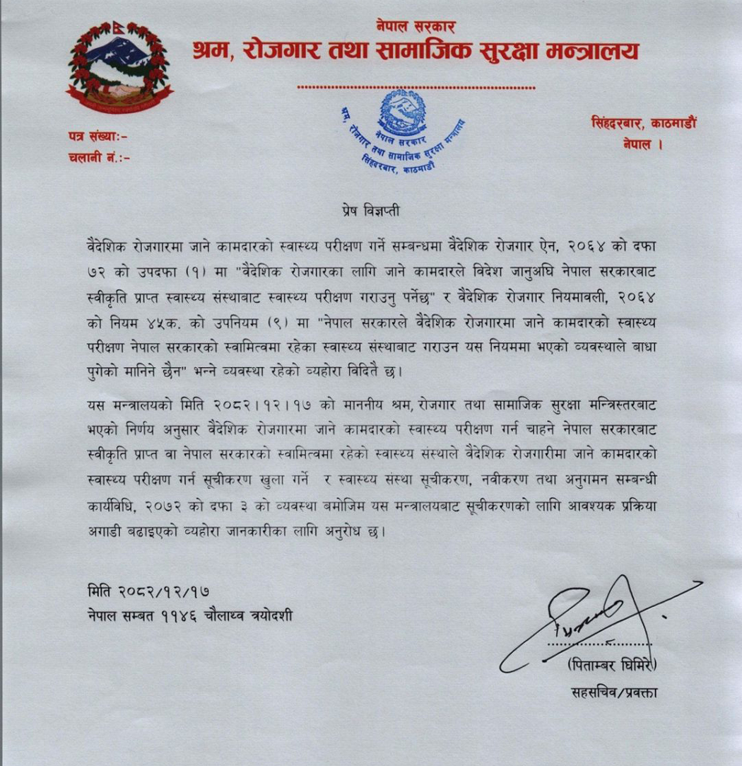 काठमाडौं । वैदेशिक रोजगारमा जाने कामदारको स्वास्थ्य परीक्षण सरकारी अस्पतालबाटै गर्न पाउने व्यवस्था मिलाइएको छ । श्रम, रोजगार तथा सामाजिक सुरक्षा मन्त्रालयले आज सूचना जारी गर्दै नेपाल सरकारबाट स्वीकृत वा सरकारी स्वामित्वका स्वास्थ्य संस्थाबाट स्वास्थ्य परीक्षण गराउन पाउने उल्लेख गरेको छ ।
