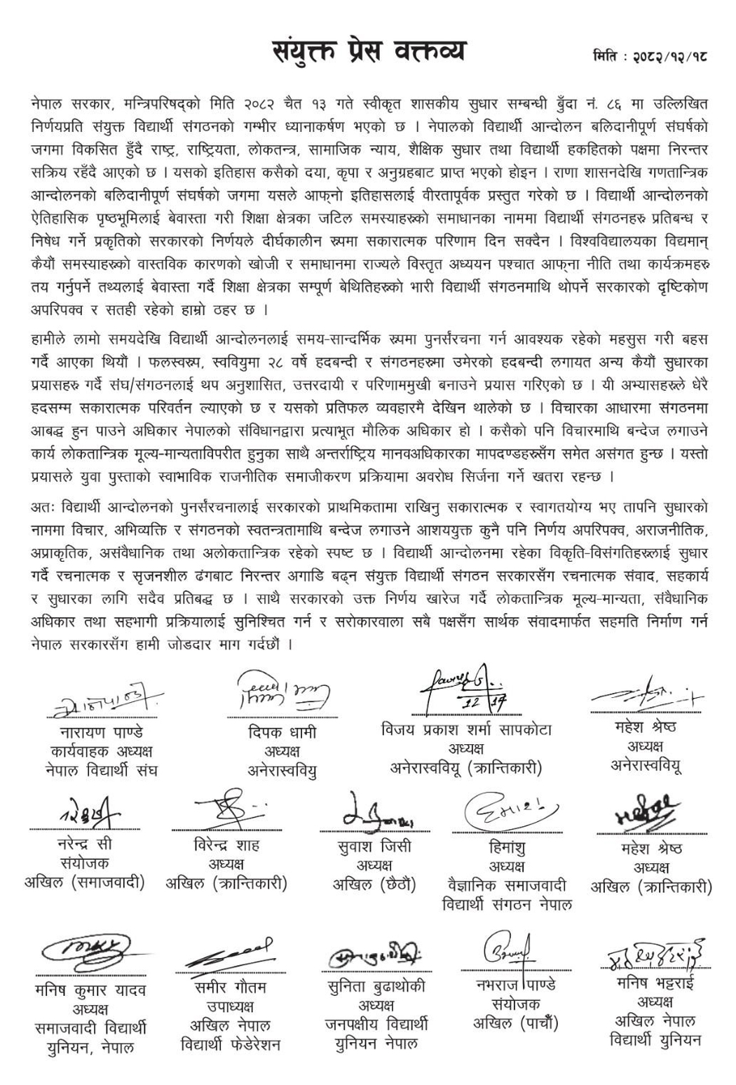 विश्वविद्यालयका विद्यमान समस्याहरूको वास्तविक कारण पहिचान गर्नुको सट्टा विद्यार्थी संगठनहरूलाई नै प्रतिबन्ध वा निषेध गर्ने दिशामा सरकार अघि बढ्नु लोकतान्त्रिक मूल्य र मान्यता विपरीत हुने वक्तव्यमा उल्लेख छ ।