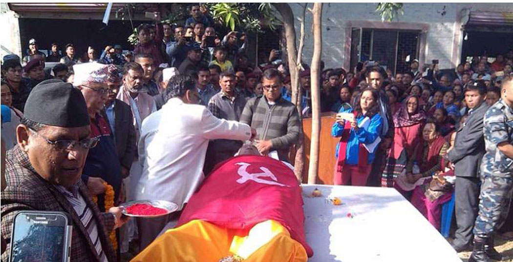 चितवन, ६ मंसिर । जनवादी गायक खुशीराम पाख्रिनको पार्थिव शरीरमा माओवादी अध्यक्ष प्रचण्ड र एमाले अध्यक्ष केपी शर्मा ओलीले संयुक्तरुपमा पार्टीको झण्डा ओढाएर श्रद्धाञ्जली दिएका छन् ।