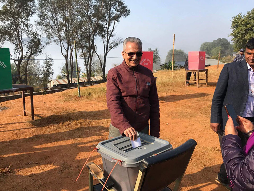 नयाँ शक्ति पार्टीका संयोजक एवं लोकतान्त्रिक गठबन्धनबाट गोर्खा क्षेत्र नं २ प्रतिनिधिसभाका उम्मेदवार डा. बाबुराम भट्टराई पालुङ्गटार– १ खोप्लाङ्गको अन्नपूर्ण मावि मतदान केन्द्रमा मतदान गर्दै ।