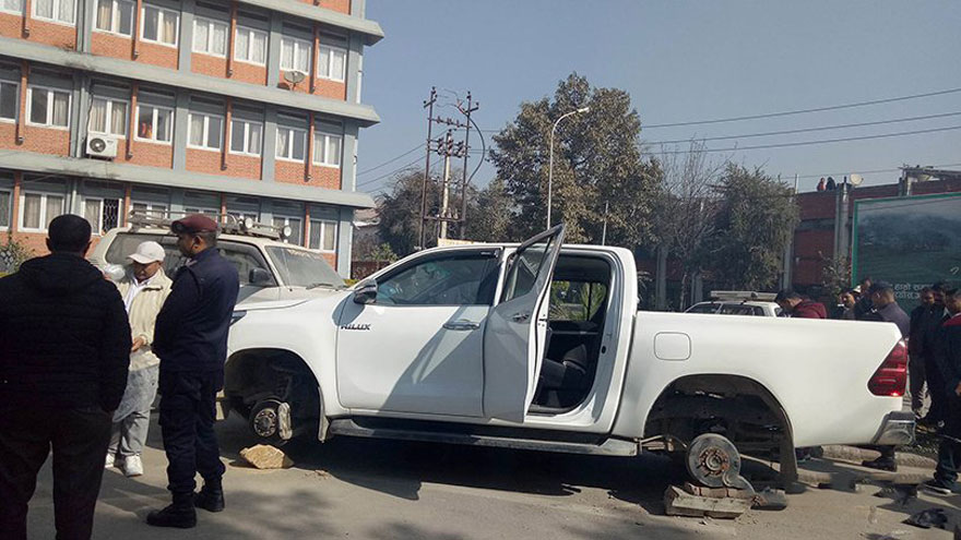 तर, आइतबार आउँदा गाडीका चार वटै टायर चोरी भएको पाइएको छ । आइतबार विहान प्रमुख शर्मालाई लिनका लागि पार्किङमा आइपुग्दा चारवटै टायर नभेटेपछि श्रेष्ठले प्रहरीलाई खबर गरेका थिए ।