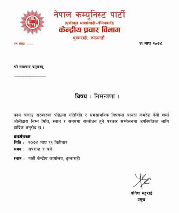 काठमाडौ, ११ माघ। नेकपा एमालेले बिहीवार पत्रकार सम्मेलन गरि सरकारका पछिल्ला निर्णय र अन्य विषयमा धारणा सार्वजनिक गर्ने भएको छ ।