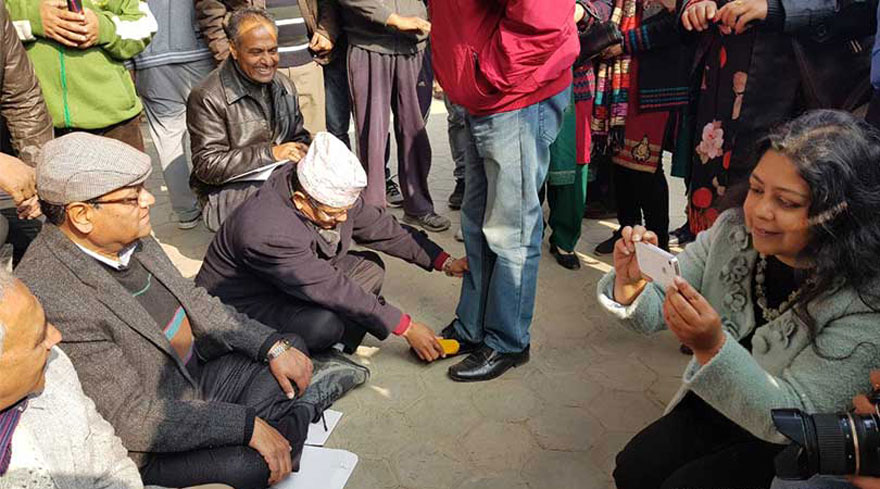 सो कार्यक्रममा काँग्रेसका केन्द्रीय सदस्य चन्द्र भण्डारी, धनराज गुरुङ, विनोद भट्टराईलगायतले बाटो हिँड्ने (बटुवा)को जुत्तामा पालिस लगाउनुभएको थियो ।