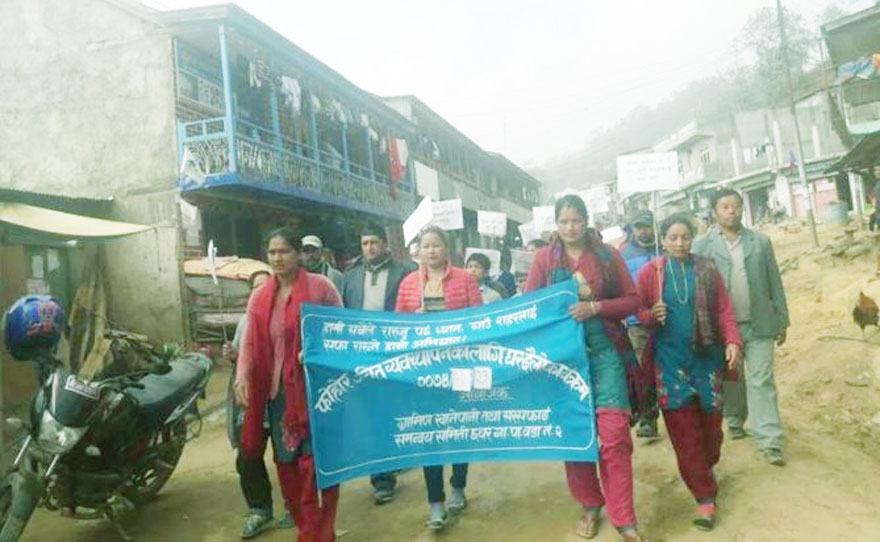 प्लेकार्ड सहित वडा कार्यालयबाट निस्केको र्यालीले बजारको आहालडाँडा चौक,बिच बजार, सिरान बजार,सरस्वती बिद्यालय क्षेत्र गाउँपालिका लगायतको स्थानको परिक्रमा गरेको थियो ।
