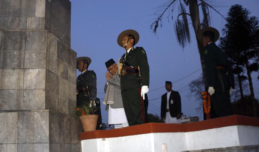 राष्ट्रपति कार्यालय, शीतल निवासमा आज साँझ आयोजित विशेष समारोहमा राष्ट्रपति विद्यादेवी भण्डारीबाट पद तथा गोपनीयताको शपथलगत्तै प्रधानमन्त्री ओलीले शहीद उद्यान पुगी शहीदप्रति पुष्पगुच्छाद्वारा श्रद्धाञ्जलि अर्पण गर्नुभएको हो ।