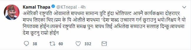 पूर्वउपप्रधानमन्त्री थापाले ट्विटरमा लेखेका छन्, ‘प्रम केपी ओलीले शपथमा ‘देश’ शब्द उच्चारण गर्न छुटाउनु भयो । निश्चय नै यो नियतवस होइन । त्यसर्थ राष्ट्रपति समक्ष पुनः शपथ लिई अभिलेख सच्याउन सल्लाह दिन्छु । शपथमा देश छुट्नु राम्रो होइन ।’