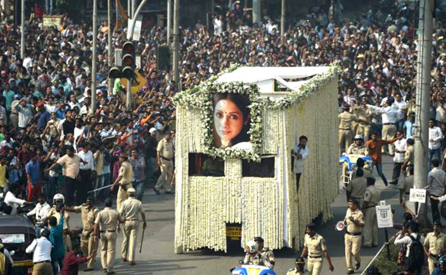 विशेष रूपमा सिङ्गारिएको एउटा ट्रकमा राखेर उहाँको शवलाई सात किलोमिटर टाढा रहेको अन्त्येष्टि स्थलमा लगिएको थियो । शवयात्राका कारण लामो समय मुम्बईको सडकमा ट्राफिक व्यवस्था अस्तव्यस्त भएको थियो भने अन्त्यष्टीस्थलसम्म पुग्न झण्डै दुई घण्टा लागेको थियो ।