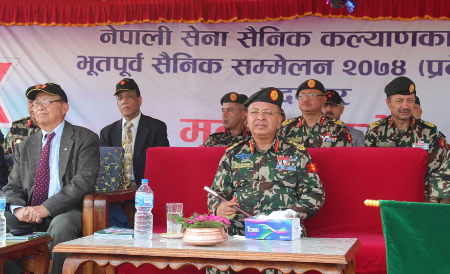 उदयपुरस्थित नेपाली सेनाको १८ नं बाहिनी भुल्केमा आज आयोजित भूपू सैनिक सम्मेलन तथा स्वास्थ्य शिविरमा उहाँले देशको सार्वभौमसत्ता, भौगोलिक अखण्डता, स्वाधीनता र राष्ट्रिय एकताको रक्षा गर्नु हाम्रो परम कर्तव्य रहेको बताउँदै भन्नुभयो, “राष्ट्रहित विपरीत हुन सक्ने आन्तरिक तथा बाह्य चुनौतीको सिलसिलामा नेपालको संविधानबमोजिम सरकारद्वारा दिइने सबै जिम्मेवारी पूरा गर्न नेपाली सेनाले कुनै कसर बाँकी राख्ने छैन ।”