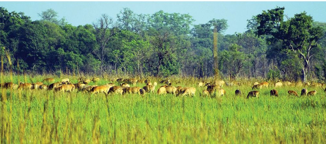 भीमदत्तनगर, २२ चैत।  अहिले वसन्त ऋतुको याम छ । शुक्लाफाँटा राष्ट्रिय निकुञ्जभित्रको विशाल घाँसे मैदानको पश्चिमतर्फ सूर्यास्तको मनोरम दृश्यसँगै बाह्रसिङ्गेको झुण्ड सहजै देख्न पाइन्छ ।