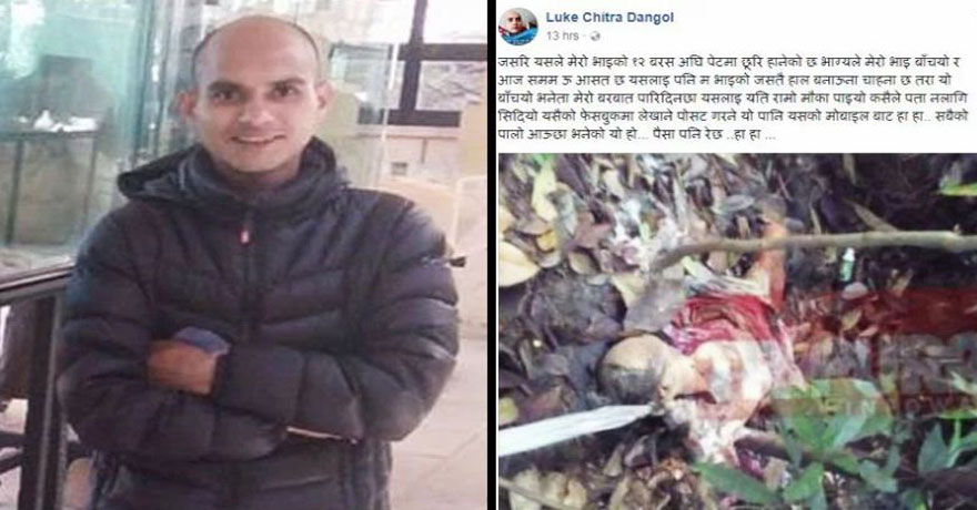 स्थानीय मोडर्न ट्रिनिटी इङ्लिस बोर्डिङका अध्यक्ष एवं संस्थापक समेत रहेका उनको फेसबुक एकाउन्टबाट सोमबार झाडीमा पल्टिरहेको मानिसको तस्वीर पोष्ट भएको हो ।