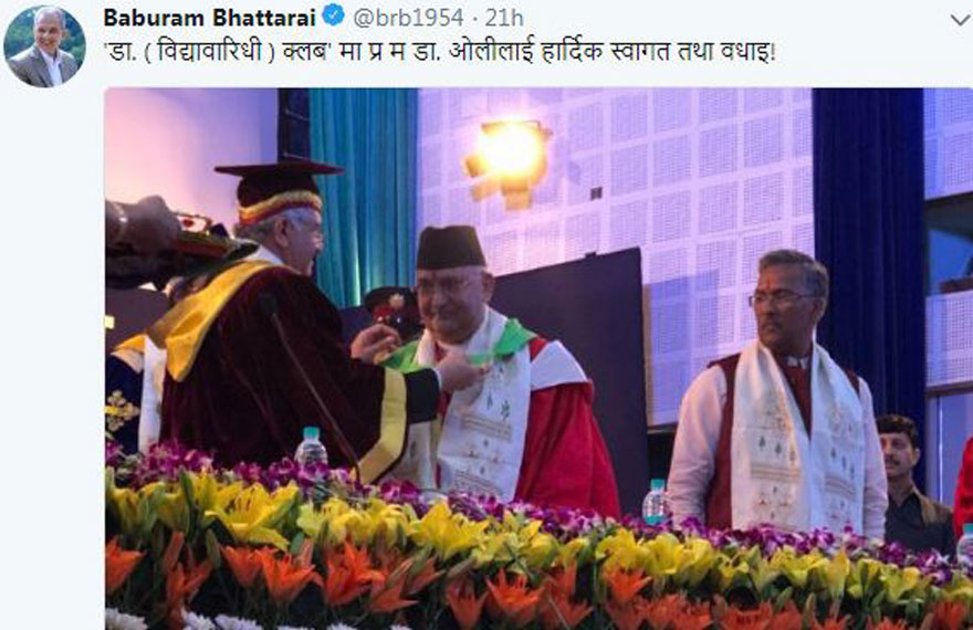 भट्टराईले आइतबार ट्विट गर्दै ओलीलाई स्वागत तथा बधाई दिएका हुन् । भट्टराईले द्विटमा ‘डा. ( विद्यावारिधी ) क्लब’ मा प्रम डा. ओलीलाई हार्दिक स्वागत तथा वधाइ!’ लेखेका छन् ।