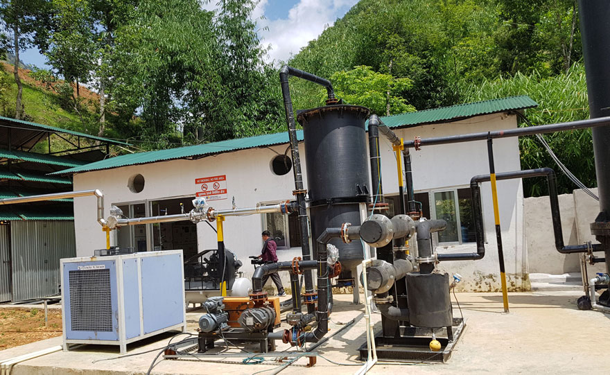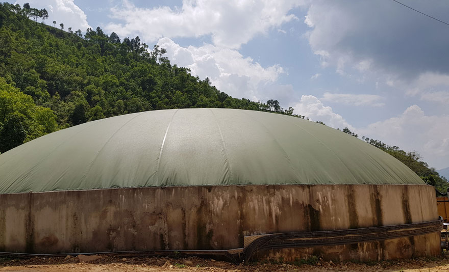 स्याङ्जा पुतलीबजार नगरपालिका–४ भालुपहाड नागडाँडामा खिलुङ–कालिका एग्रो फर्मले सञ्चालन गरेको तीन हजार ५१० घनमीटर क्षमताको अत्याधुनिक बायोग्यास पावर प्लान्ट । यस प्लान्टबाट ४०० किलोवाट विद्युत् उत्पादनसँगै दैनिक १५ टन जैविक मल उत्पादन हुने गरेको छ । तस्बिर: रासस