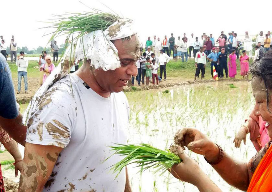 त्यती मात्रै होइन कृषिमन्त्रीको टाउकोमा समेत धानको विउ देखिएको छ । टाउकोमा सेतो फेटाले धानको विउ बाधेका थिए । उनले निधारमा हिलोको टिका समेत लागए ।