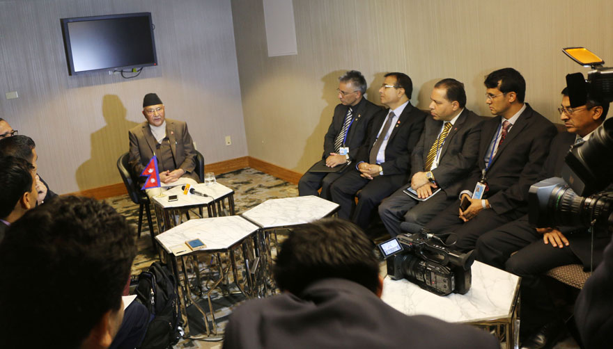 प्रधानमन्त्री ओलीले असोज ११ गते महासभालाई सम्बोधन गर्दै हुनुहुन्छ । उहाँले अघिल्लो पटक र यस पटक अमेरिका भ्रमण गर्दाको नेपालको अवस्था निकै फरक रहेको बताउँदै नेपाली जनताले प्राप्त गरेको उपलब्धिका विषयमा विश्वलाई जानकारी दिने र नेपाली जनताको प्रगतिमा उनीहरूको सहयोग जुटाउने आफ्नो भ्रमणको उद्देश्य रहेको बताउनुभयो । प्रधानमन्त्री ओलीसँग लिइएको अन्तर्वार्ताको सम्पादित अंशः