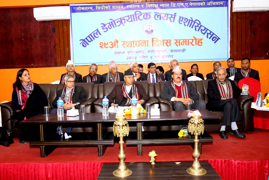 नेपाल डेमोक्र्याटिक लयर्स एशोसियसनको २९औँ स्थापना दिवसका अवसरमा आज यहाँ आयोजित कार्यक्रमलाई सम्बोधन गदैं उनले व्यवस्थापिका र कार्यपालिकाको गलत क्रियाकलाप रोक्ने स्वतन्त्र न्यायपालिकालाई सरकारको दबाबमा राख्न खोजिएको बताए ।
