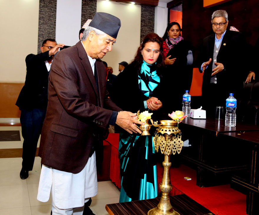 नेपाली काँग्रेसका सभापति शेरबहादुर देउवा बुधबार नेपाल डेमोक्र्याटिक लर्यस एशोसिएशनको २९ औँ स्थापना दिवस समारोहको उद्घाटन गर्दै । तस्वीरः रासस