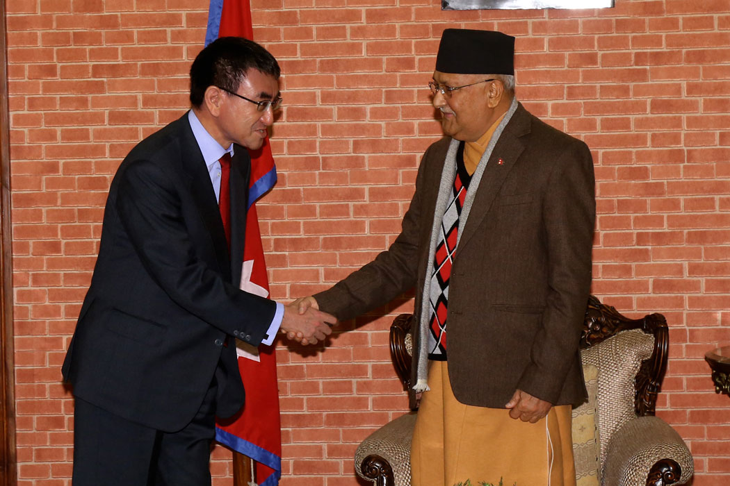 काठमाडौँ, २६ पुस । प्रधानमन्त्री केपी शर्मा ओलीसँग नेपालको दुई दिवसीय भ्रमणमा रहनुभएका जापानका विदेशमन्त्री तारो कोनोले आज प्रधानमन्त्री निवास बालुवाटारमा शिष्टाचार भेट गर्नुभयो ।