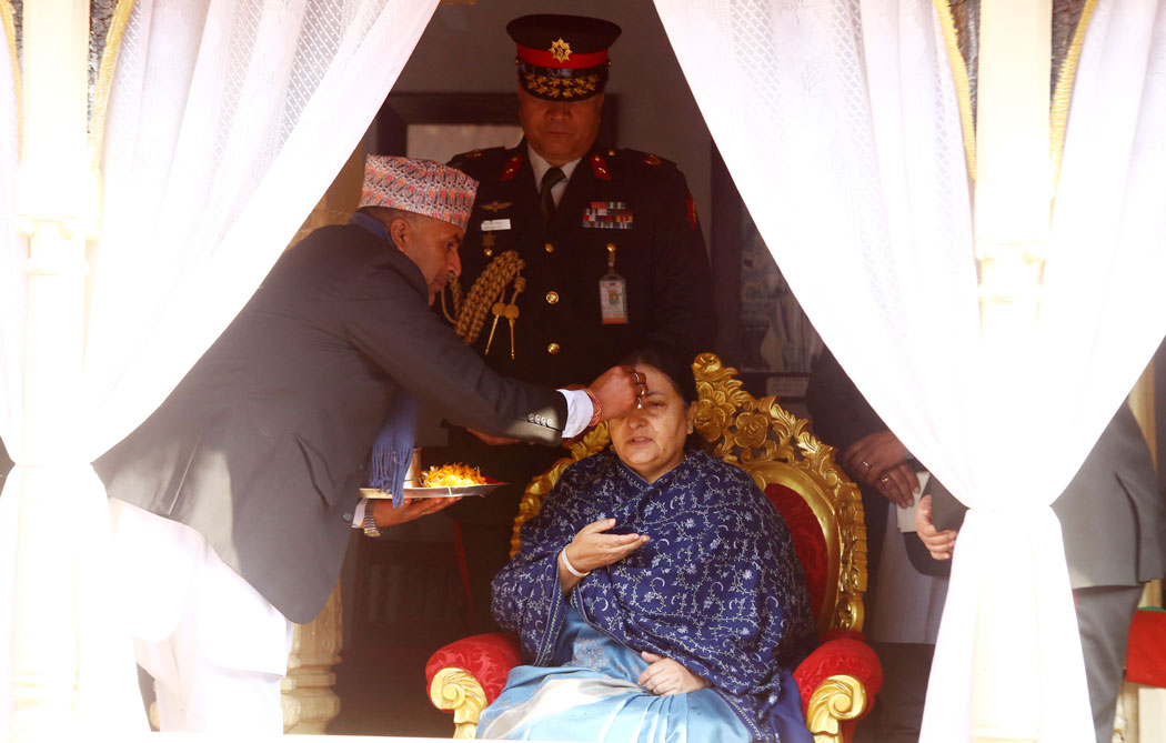 हनुमानढोका दरबारस्थित नासलचोकमा आयोजित विशेष समारोहमा राष्ट्रपतिसमक्ष हनुमानढोका हेरचाह अड्डाका मूल पुरोहित देवराज अर्यालले अभिषेक, टीका, माला र फूलप्रसाद प्रदान गर्नुभएको थियो ।