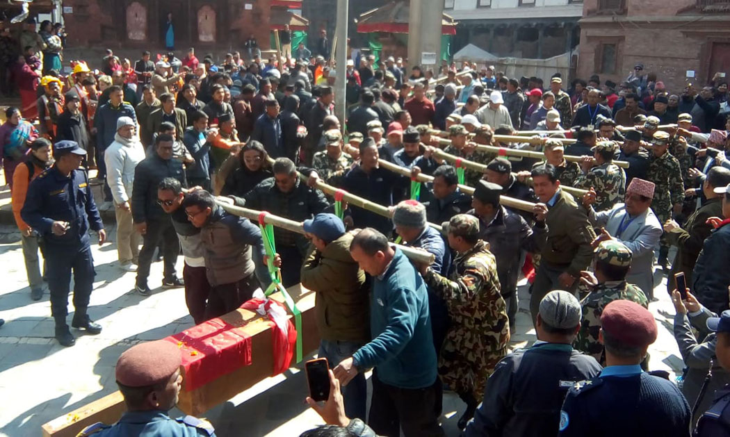 काठमाडौँ, २७ माघ । विश्व सम्पदामा सूचीकृत हनुमानढोका दरबार क्षेत्र नजीकै रहेको काष्ठमण्डप पुनःनिर्माणका लागि आवश्यक तीन स्तम्भ हनुमानढोका क्षेत्रबाट निर्माणस्थलमा आज लगिएको छ ।