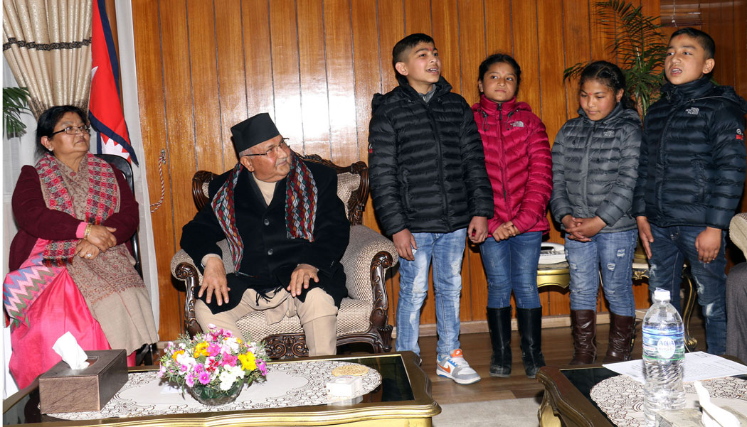 यी बालबालिकालाई अभिभावकत्व दिनु चानचुने कुरा नभएको उल्लेख गर्दै प्रधानमन्त्री ओलीले बालबालिकासँग आफ्नो पनि भावनात्मक सम्बन्ध जोडिएकोे बताउनुभयो । केही गरेँ भनेर धाक लगाउने अवस्था नभए पनि यस्ता बालबालिकालाई केही गर्ने सोच बनाएको र सरकारको ध्यान जाने आश्वासन दिँदै उहाँले सिङ्गै देशलाई शिक्षित बनाउने अभियानमा सरकार रहेको बताउनुभयो ।