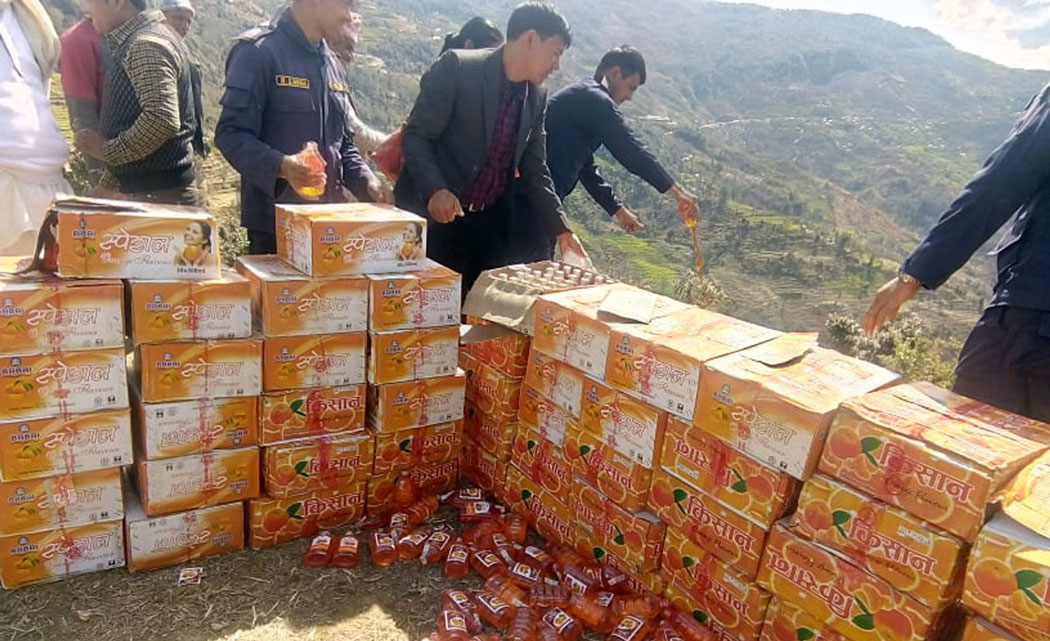 अछाम, १३ फागुन । मेल्लेख गाउँपालिकामा गाडी सहित स्थानिय महिला सञ्जाल र प्रहरीको सक्रियतामा ६७ पेटी कमसल मदिरा नष्ट गरिएको छ ।