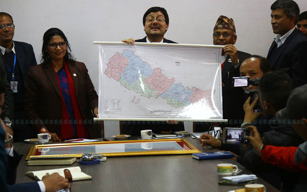 काठमाडौँ, २३ फागुन । मुलुकको परिवर्तित संरचनाअनुसार सातै प्रदेशलाई रेखाङ्कन गरिएको नेपालको प्रशासनिक नक्सा आजदेखि प्रचलनमा ल्याइएको छ ।