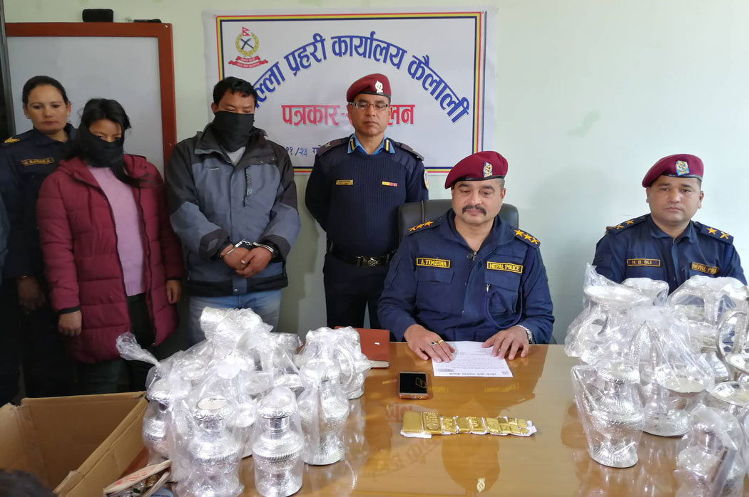 धनगढी, २३ फागुन । कैलालीको चिसापानीमा गए राति प्रहरीले दुई किलो ३०० ग्राम सुन र चाँदीका पूजा सामग्रीसहित दुई जनालाई पक्राउ गरेको छ ।