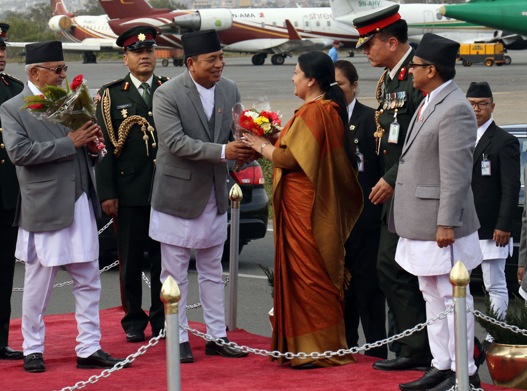 स्वदेश फर्कने क्रममा उहाँलाई त्रिभुवन अन्तरराष्ट्रिय विमानस्थलको अतिविशिष्ट कक्षमा उपराष्ट्रपति, प्रधानमन्त्री, उपप्रधानमन्त्री तथा रक्षामन्त्री र परराष्ट्रमन्त्रीले स्वागत गर्नुभएको थियो । सो अवसरमा मन्त्रिपरिषद्का सदस्य, सांसद, संवैधानिक अङ्गका प्रमुख, विशिष्ट श्रेणीका सरकारी कर्मचारी, सुरक्षा निकायका प्रमुखलगायतको पनि उपस्थिति थियो ।