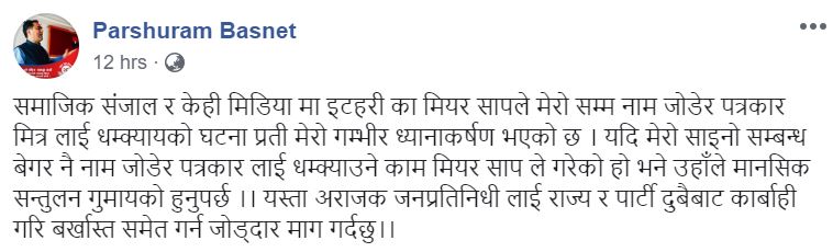 पत्रकार विराट अनुपमलाई बारम्बार ज्यान लिने सम्मको धम्की दिएका मेयर चौधरीले बस्नेतकोसमेत नाम जोडेका हुन् । उनले सुरक्षित भएर हिँड्नु भन्दै राजनीति गर्ने मान्छेले जे पनि गर्न सक्ने भनि धम्की दिएका थिए ।