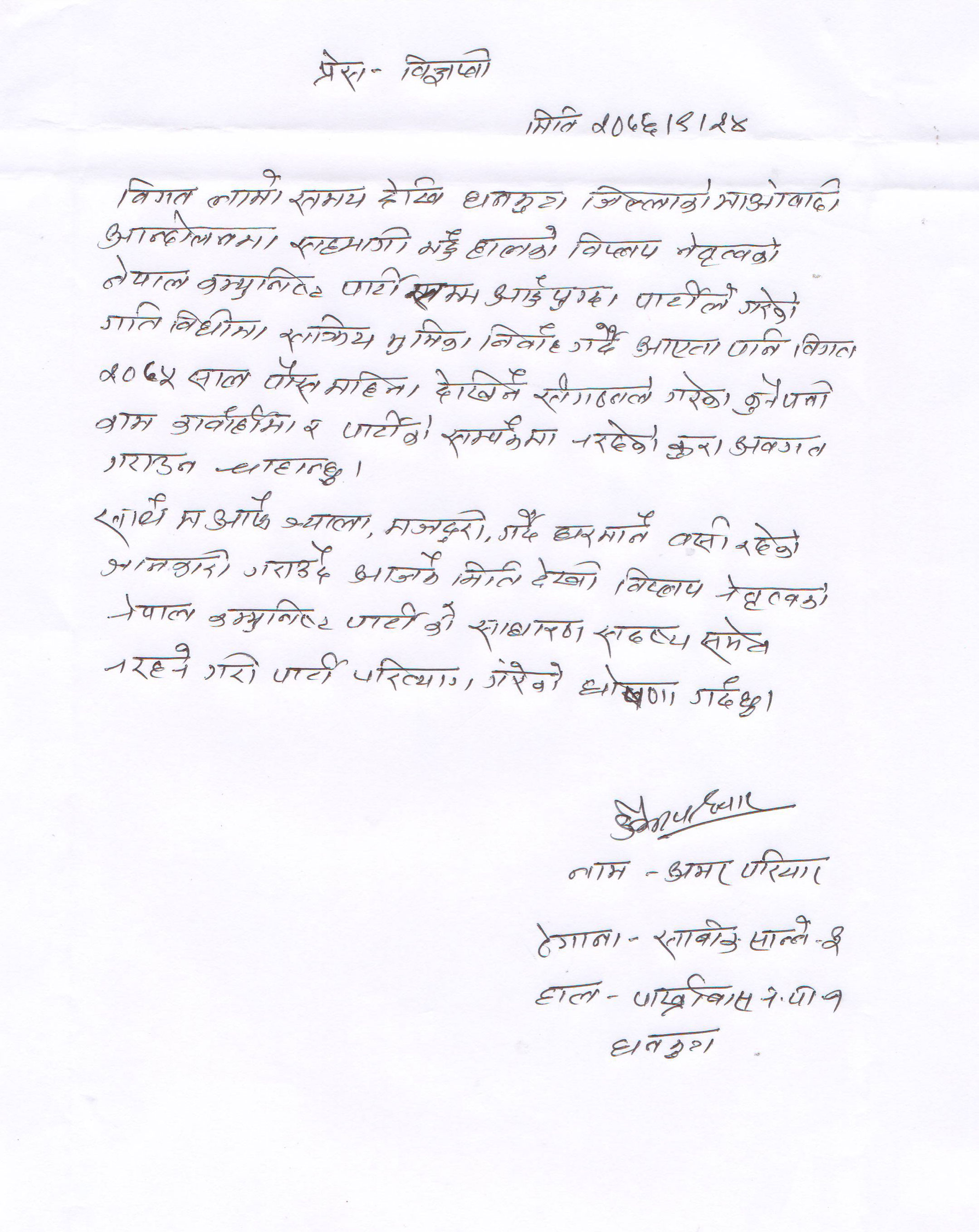 ‘२०७५ पौष महिनादेखिनै पार्टीको गतिबिधि र पार्टीको सम्पर्कमा नभएतापनि आजको मितिदेखि पार्टीको साधारण सदस्यसमेत नरहने गरी पार्टी परित्यागको घोषणा गर्दछु ।’ बिज्ञप्तीमा भनिएको छ ।