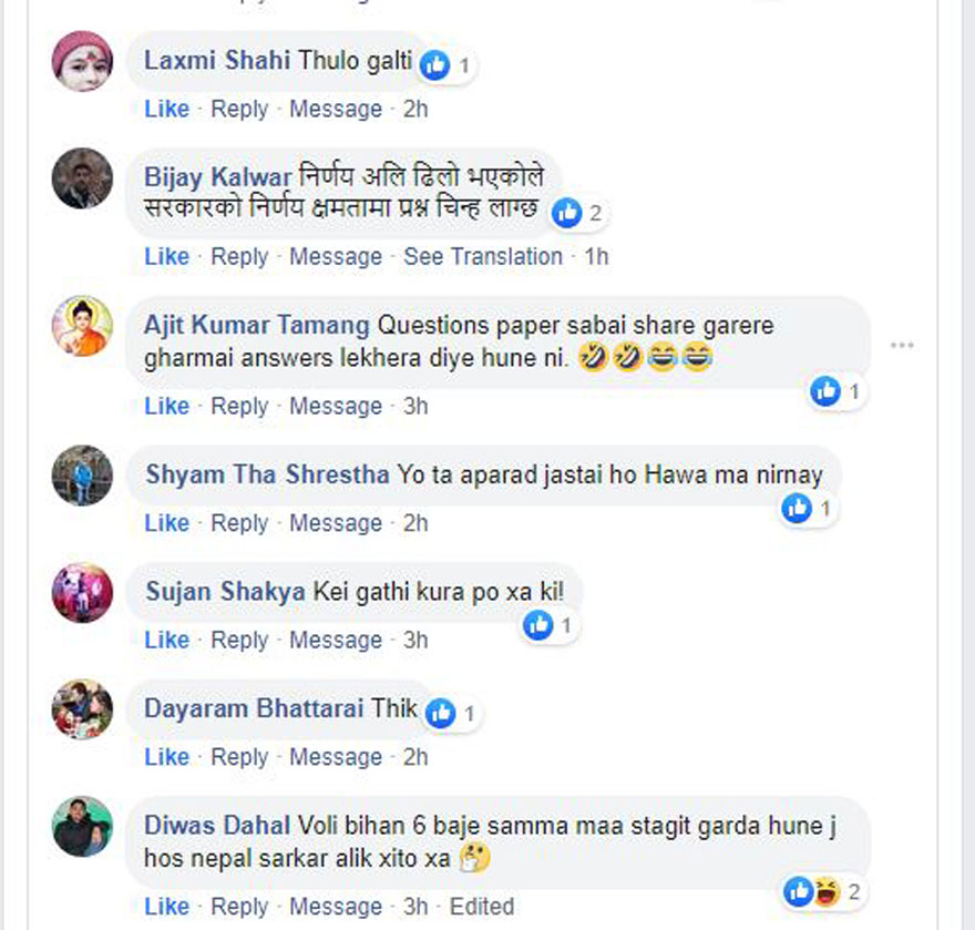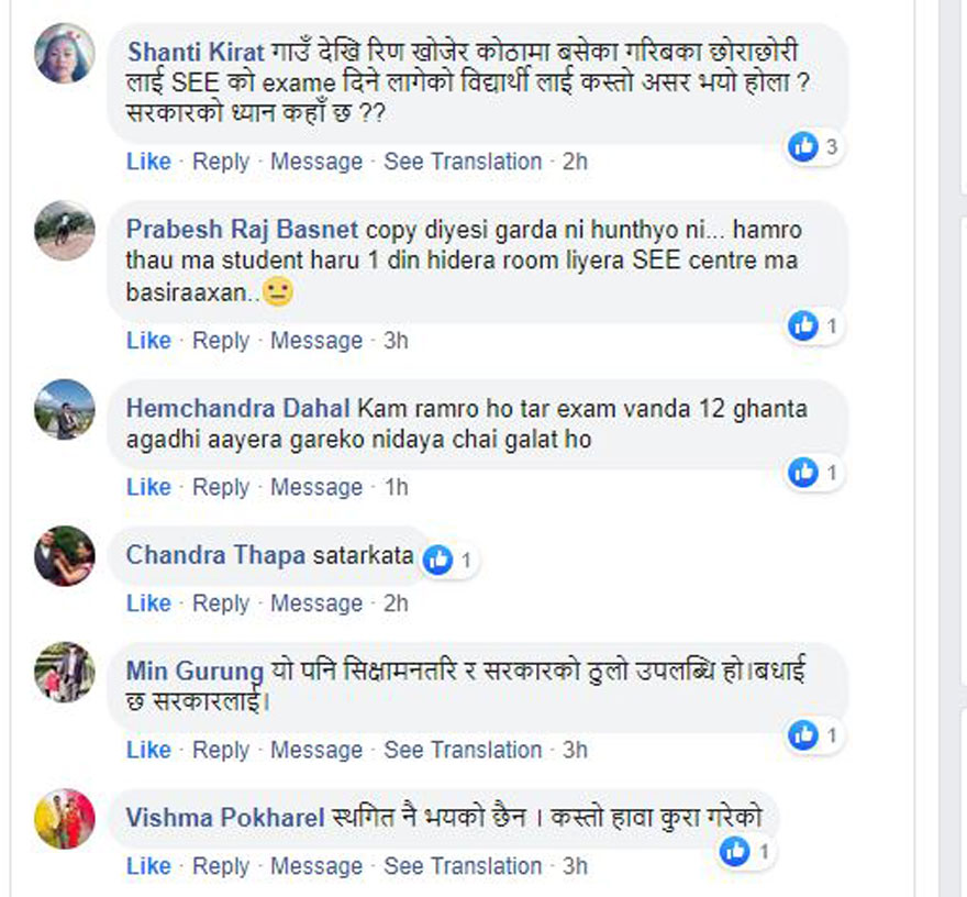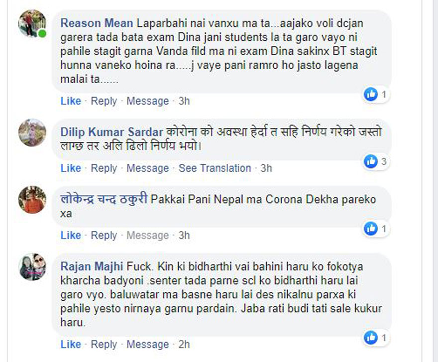 कोरोनाको संक्रमण विश्वभर फैलिरहेको अवस्थामा परीक्षा स्थगित गरिनु सहि भएपनि अन्तिम अवस्थामा आएर निर्णय गरिनु गलत भएको धेरैको तर्क छ ।