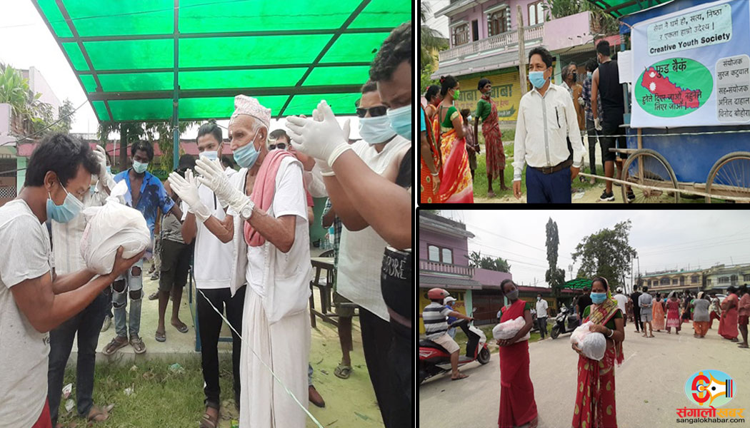 ९० बर्षिय जेष्ठ नागरिक बालकृष्ण घिमिरेको हातबाट अतिविपन्न परिवारका सदस्यलाई खानाको पोको वितरण गरेर फुड बैंकको उद्घाटन गरिएको छ । पाँच महिना यता पटक–पटक भईरहेको लकडाउन र निषेधाज्ञाका कारण दैनिक ज्यालादारीमा काम गरेर जिविकोपार्जन गर्नेहरुलाई विहान बेलुकाको दुई छाक टार्न मुस्किल भईरहेका बेला युवाहरुले सहयोगी अभियान थालेका हुन् । अति बिपन्नलाई विहान बेलुकाको छाक टार्ने व्यवस्था मिलाउँन फुड बैंक संचालन गरिएको अभियानका संयोजक सुरज कटुवालले बताए । उनका अनुसार निषेधाज्ञा जारी रहुन्जेल हरेक दुई–दुई दिनमा अति बिपन्न परिवारलाई भान्साको संयुक्त पोको प्रदान गरिनेछ ।