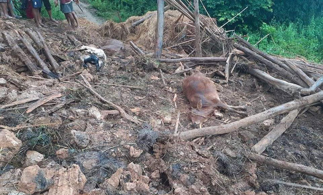 अबिरल बर्षाका कारण बिहान करिब ४ बजे गोठ भत्किएर किच्दा पाँच चौपाय मर्नुका साथै अन्य केही चौपाय घाईते भएको स्थानीय लेखनाथ पौडेलले बताए । सो गोठमा दुई दर्जन बढी चौपाय थिए । गोठ भत्किदा पुरिएका बस्तु बाख्रालाई स्थानीयबासीले उद्धार गरेका छन् ।