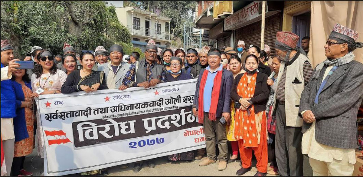 धनकुटा । संसद् विघटनको विरोधमा सोमबार धनकुटामा नेपाली काँग्रेसका नेता कार्यकर्ताले कालो पट्टी बाँधेर प्रदर्शन गरेका छन् । असंबैधानिक रुपमा संसद् विघटन गरिएको भन्दै विरोधस्वरुप काँग्रेसले प्रदर्शन गरेको हो । जिल्ला पार्टी कार्यालयबाट टाउकोमा कालोपट्टी बाँधेर निस्किएका नेता कार्यकर्ताले संसद् विघटनको विरोध गर्दै बजारमा प्रदर्शन गरे ।
