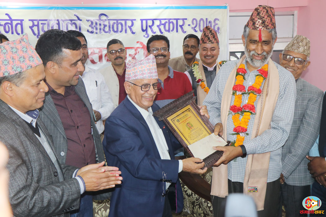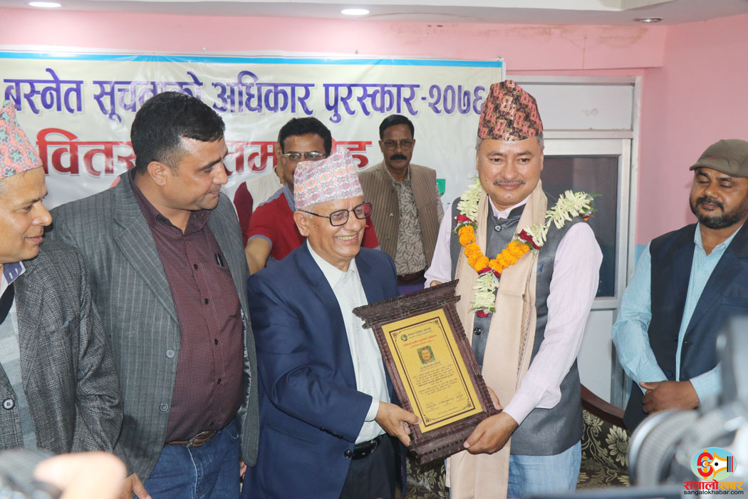सूचना अधिकारको क्षेत्रमा योगदान पुर्याएको भन्दै पत्रकार महासंघ मोरङ शाखाले शुक्रबार एक कार्यक्रमकाबीच झालाई नगद ५० हजार ५१ र न्यौपानेलाई १५ हजार १५ नगदसहित पुरस्कृत गर्यो । कार्यक्रममा १ नं. प्रदेश प्रमुख सोमनाथ अधिकारी ‘प्यासी’, पत्रकार महासंघका केन्द्रिय अध्यक्ष गोविन्द आचार्य, जिल्ला अध्यक्ष बन्धु पोख्रेल लगायतले दुवै पत्रकारलाई दोसल्ला र टोपी लगाईदिएर नगद तथा प्रमाणपत्र प्रदान गरी पुरस्कृत गरे ।