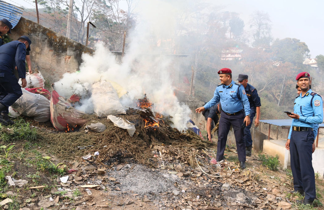 धनकुटा जिल्ला अदालत, जिल्ला प्रशासन कार्यालय र नगरपालिकाका प्रतिनिधिको रोहबरमा खाल्डोमा हालेर मट्टीतेल खन्याई गाँजा जलाइएको हो । प्रहरीले जिल्लाका बिभिन्न स्थानमा गाँजा खेति फडानी पनि गर्दै आएको छ ।