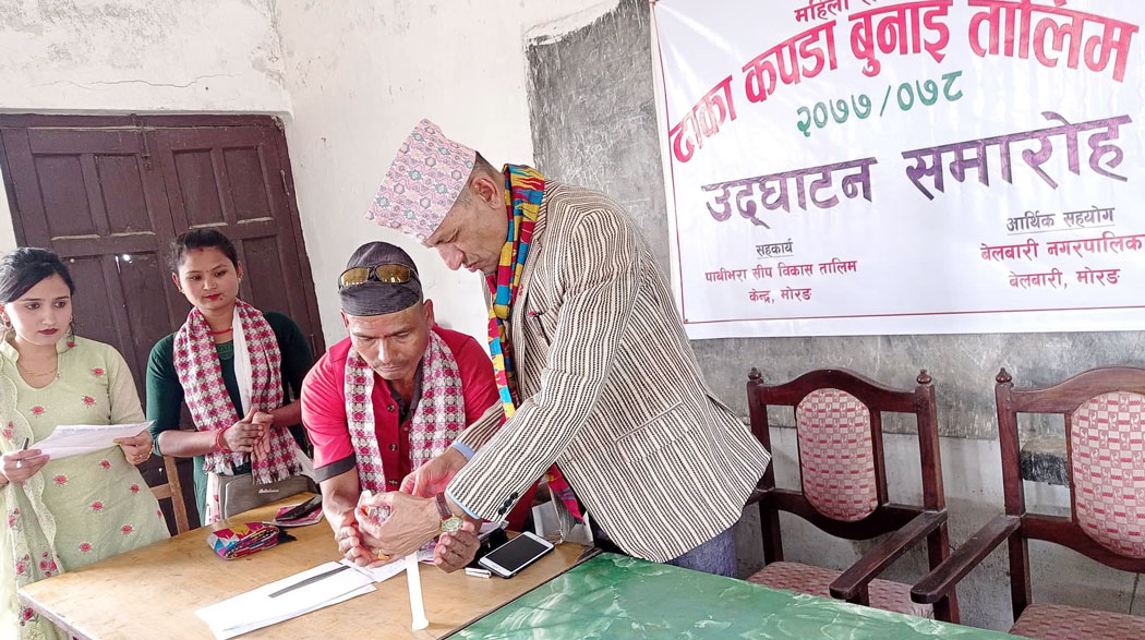 विराटनगर । मोरङको बेलबारी नगरपालिकाले महिलाहरुलाई उद्यमी बनाउने उदेश्यले ढाका बुन्ने तालिम दिन थालेको छ । वडा नम्बर ७ र ८ का ३० जनाभन्दा बढी महिलाहरुलाई तालिम दिन थालेको हो ।