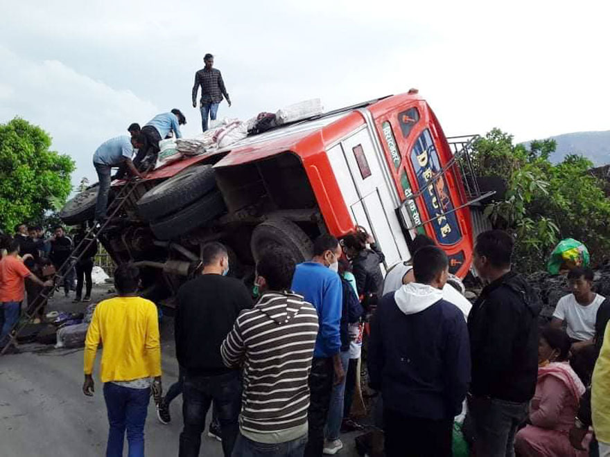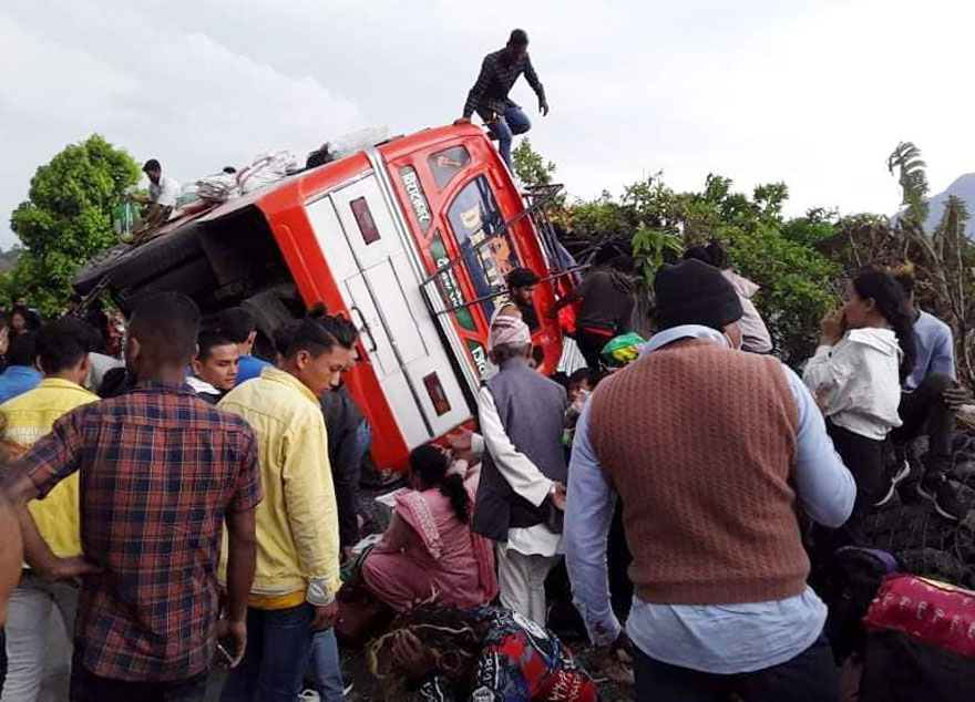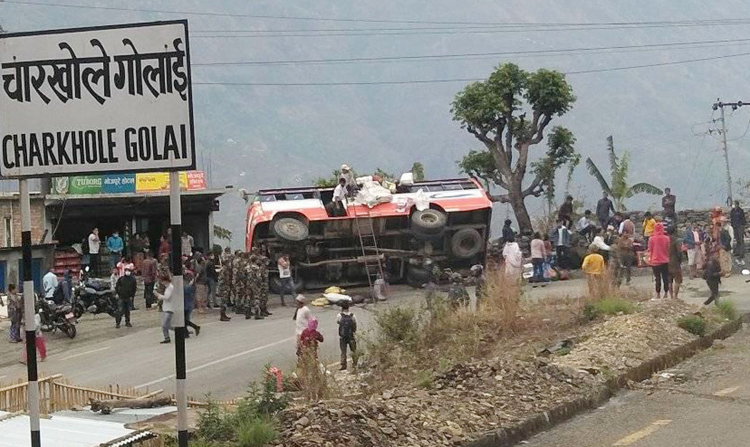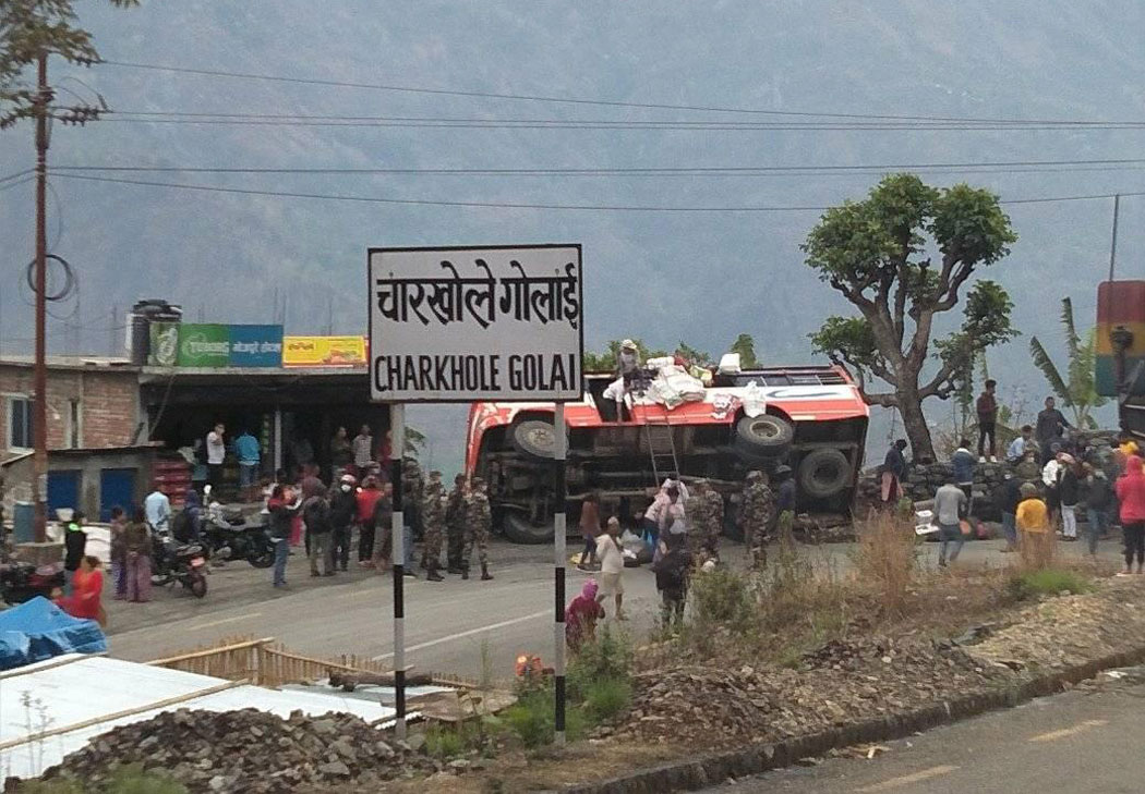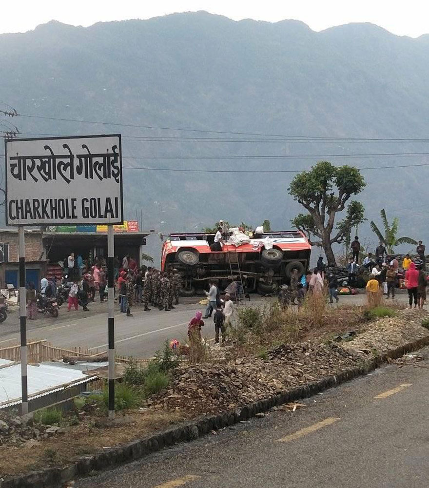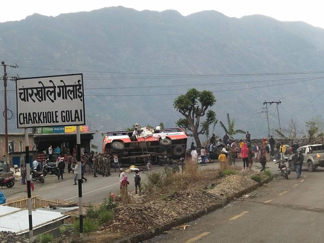 धनकुटा । धनकुटाको साँगुरीगढी गाउँपालिका–६ स्थित चारखोले गोलाइमा बिहिबार दिउँसो यात्रुबाहक बस दुर्घटना हुँदा छ जना घाइते भएका छन् । विराटनगरबाट धनकुटाको जितपुर जाँदै गरेको को १ ख ७७७९ नम्बरको बस दिउँसो करिब १२ः३० बजे सडकमा पल्टिएको हो ।