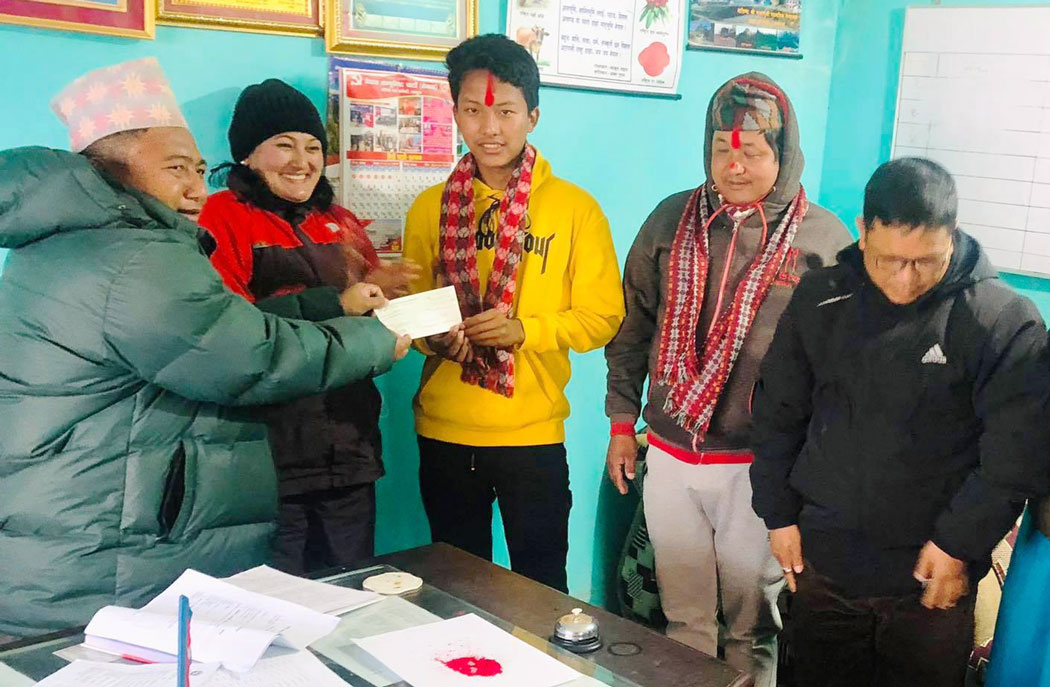 पालिका अध्यक्ष शेरबहादुर लिम्बू र उपाध्यक्ष भीमकला श्रेष्ठले सुदिपलाई चेक हस्तान्तरण गरेका हुन् । छथर जोरपाटी–५ ताम्लिङ्गस्थित महाकाली मा.बि. बाट ०७६ मा एसईई पास गरेका सुदिप अहिले धनकुटा नगरपालिकाको गोकुण्डेश्वर मा.बि.को विज्ञान संकायमा कक्षा ११ मा पढ्दैछन् ।