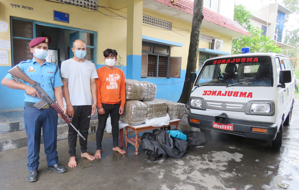 धरान उपमहानगरपालिका–२ स्थित राजमार्गबाट सोमबार साँझ करिब ७ बजे प्रहरीले गाँजासहित को १ च ५५५९ नम्बरको हुडेप नेपाल लेखिएको मारुती एम्वुलेन्सलाई नियन्त्रणमा लिएको हो । शंका लागेर चेकजाँच गर्ने क्रममा एम्बुलेन्सको पछाडिको भागमा २५/२५ किलोको चार वटा झोलामा एक सय किलो गाँजा बरामद भएको इलाका प्रहरी कार्यालय धरानका डिएसपी ज्ञानेन्द्र बस्नेतले जानकारी दिए ।