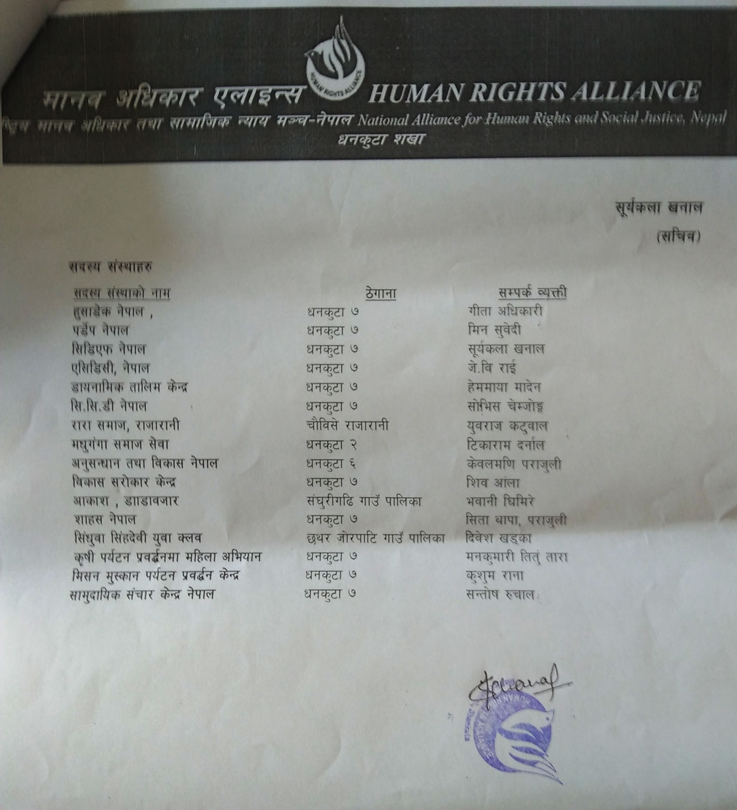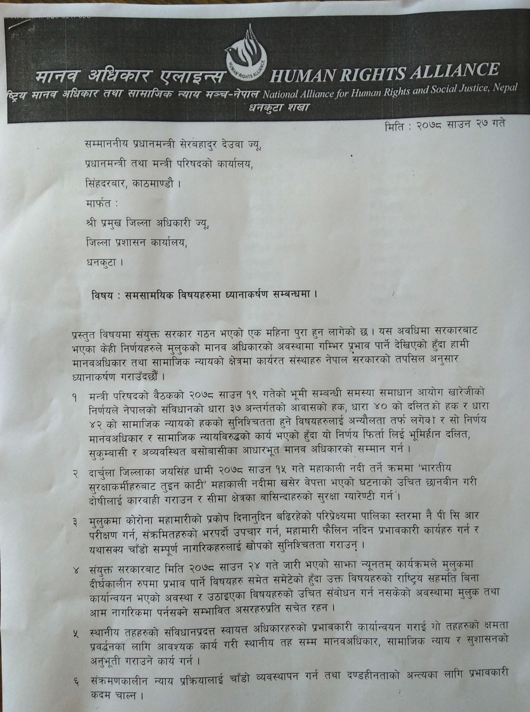 धनकुटा । मानव अधिकार एलाइन्स धनकुटाले बुधबार प्रधानमन्त्री शेरबहादुर देउवालाई ६ वुँदे ध्यानाकर्षण पत्र पठाएको छ । नयाँ सरकार गठन भएको एक महिनाको अवधिमा सरकारबाट भएका केही निर्णयहरुले मुलुकको मानव अधिकारको अवस्थालाई गम्भीर प्रभाव पार्ने देखिएको भन्दै एलाइन्सले जिल्ला प्रशासन कार्यालयमार्फत प्रधानमन्त्रीलाई ध्यानाकर्षण पत्र पठाएको हो ।